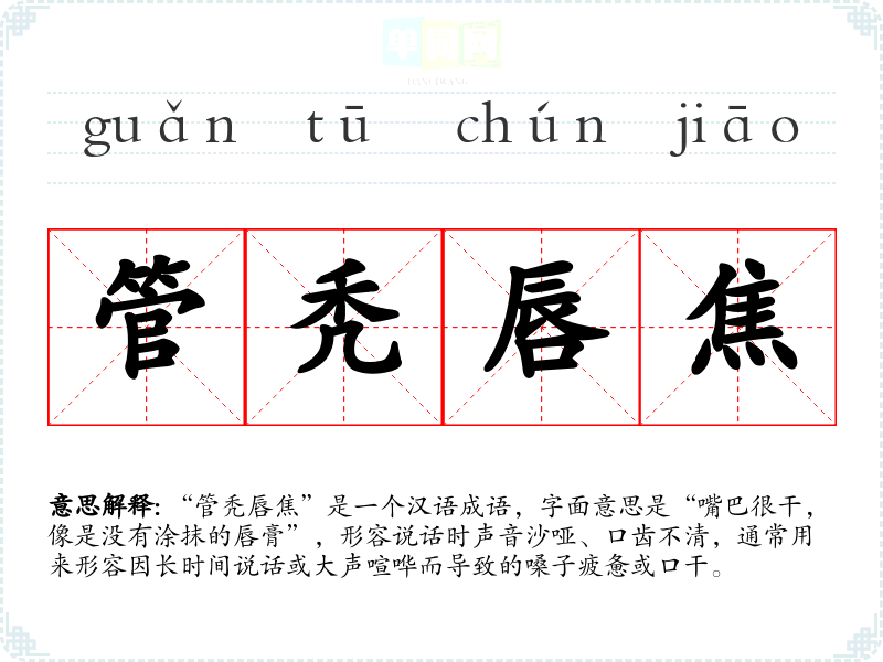“管秃唇焦”是一个汉语成语,字面意思是“嘴巴很干,像是没有涂抹的唇膏”,形容说话时声音沙哑、口齿不清,通常用来形容因长时间说话或大声喧哗而导致的嗓子疲惫或口干。