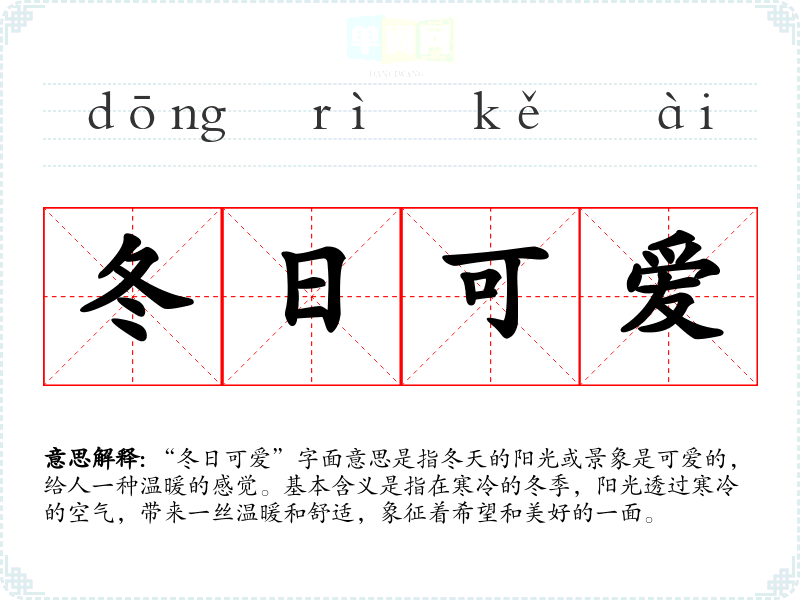 “冬日可爱”并不是一个传统的成语,而是一个现代汉语表达,可能源自于对冬季自然景象的赞美。在古典文学中,类似的表达常常用以描绘冬季的阳光和温暖,传达出一种积极向上的情绪。