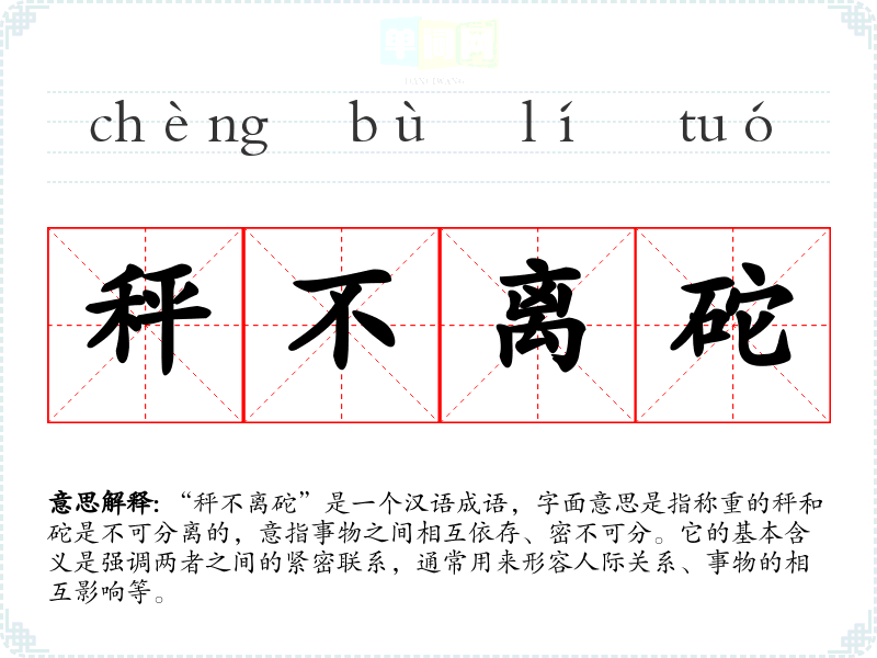 “秤不离砣”是一个汉语成语,字面意思是指称重的秤和砣是不可分离的,意指事物之间相互依存、密不可分。它的基本含义是强调两者之间的紧密联系,通常用来形容人际关系、事物的相互影响等。