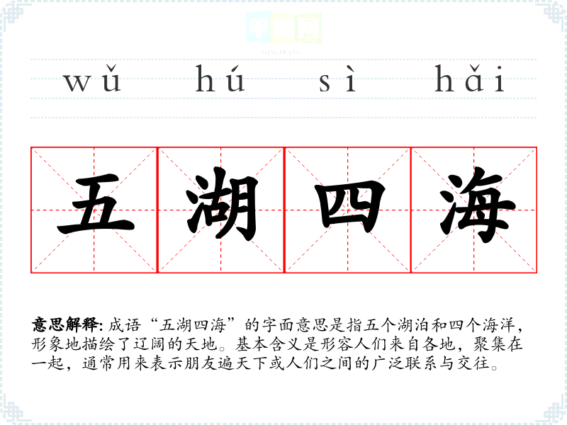 成语“五湖四海”的字面意思是指五个湖泊和四个海洋,形象地描绘了辽阔的天地。基本含义是形容人们来自各地,聚集在一起,通常用来表示朋友遍天下或人们之间的广泛联系与交往。