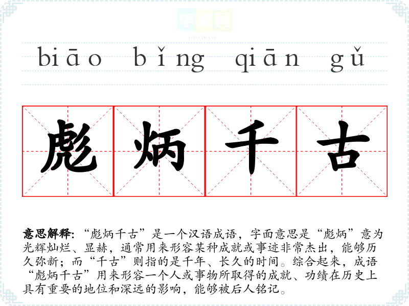 | 彪炳千古 | 形容伟大的业绩流传千秋万代。 |