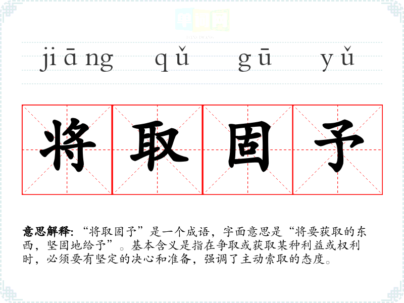 “将取固予”是一个成语,字面意思是“将要获取的东西,坚固地给予”。基本含义是指在争取或获取某种利益或权利时,必须要有坚定的决心和准备,强调了主动索取的态度。