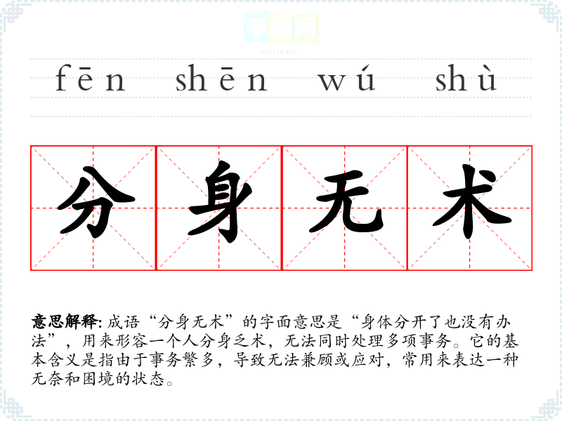 成语“分身无术”的字面意思是“身体分开了也没有办法”,用来形容一个人分身乏术,无法同时处理多项事务。它的基本含义是指由于事务繁多,导致无法兼顾或应对,常用来表达一种无奈和困境的状态。