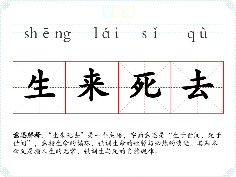 “生来死去”是一个成语,字面意思是“生于世间,死于世间”,意指生命的循环,强调生命的短暂与必然的消逝。其基本含义是指人生的无常,强调生与死的自然规律。