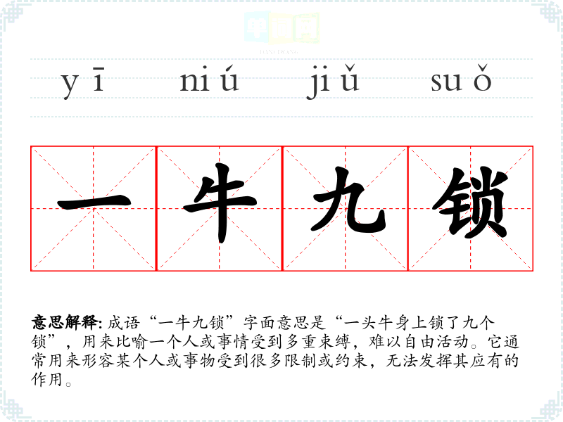 成语“一牛九锁”字面意思是“一头牛身上锁了九个锁”,用来比喻一个人或事情受到多重束缚,难以自由活动。它通常用来形容某个人或事物受到很多限制或约束,无法发挥其应有的作用。