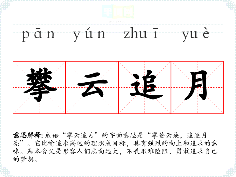 该成语常用于文学作品、演讲、日常对话中,尤其是在表达追求理想、奋斗精神时。比如,教师在鼓励学生时,可以说:“你们要攀云追月,努力学*,追求更高的目标。”