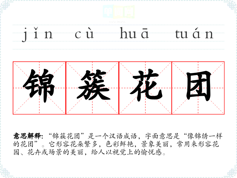 成语“锦簇花团”中的“锦”指的是华丽的织物,“簇”意为聚集、团聚,而“花团”则是指花朵聚集成团。这个成语并没有特定的历史典故,但它常出现在古典诗词中,表现出人们对于美丽自然景象的赞美。