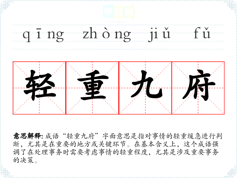 成语“轻重九府”字面意思是指对事情的轻重缓急进行判断,尤其是在重要的地方或关键环节。在基本含义上,这个成语强调了在处理事务时需要考虑事情的轻重程度,尤其是涉及重要事务的决策。