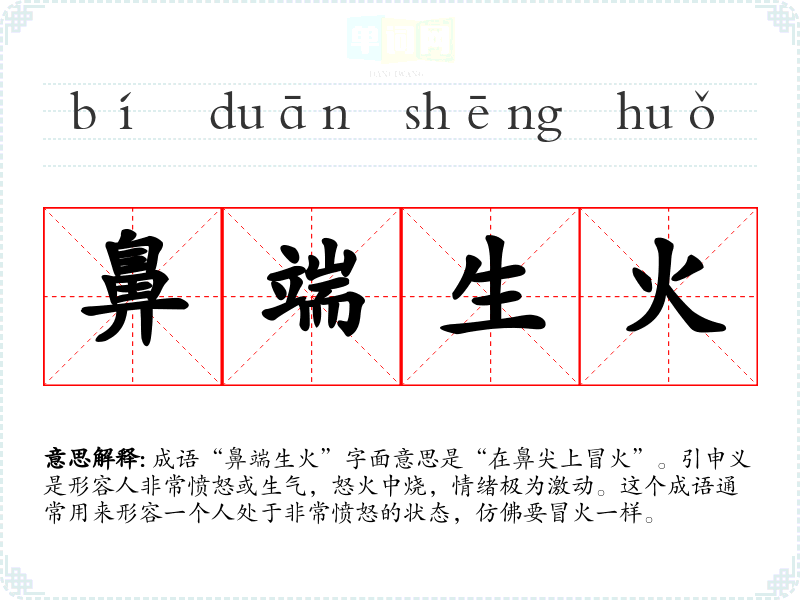 - 怒火中烧:指心中充满愤怒,情绪激动,和“鼻端生火”含义相近。