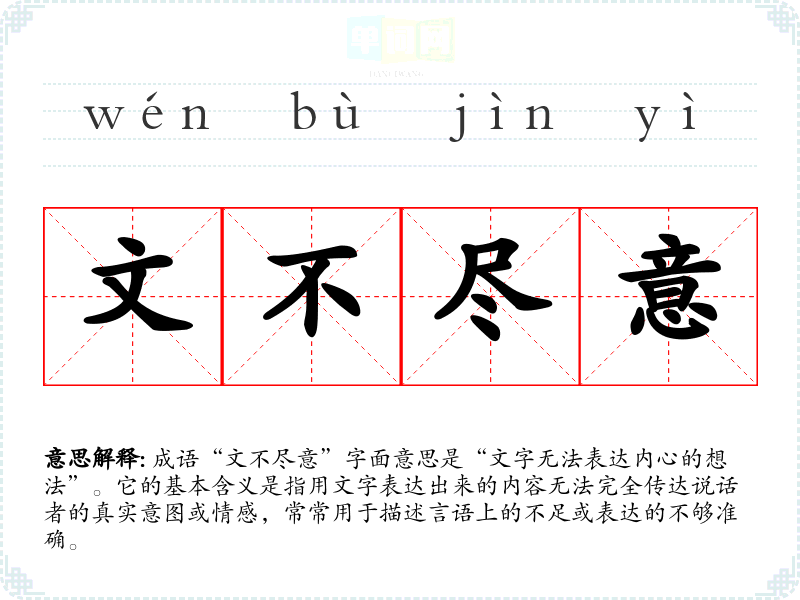 成语“文不尽意”字面意思是“文字无法表达内心的想法”。它的基本含义是指用文字表达出来的内容无法完全传达说话者的真实意图或情感,常常用于描述言语上的不足或表达的不够准确。