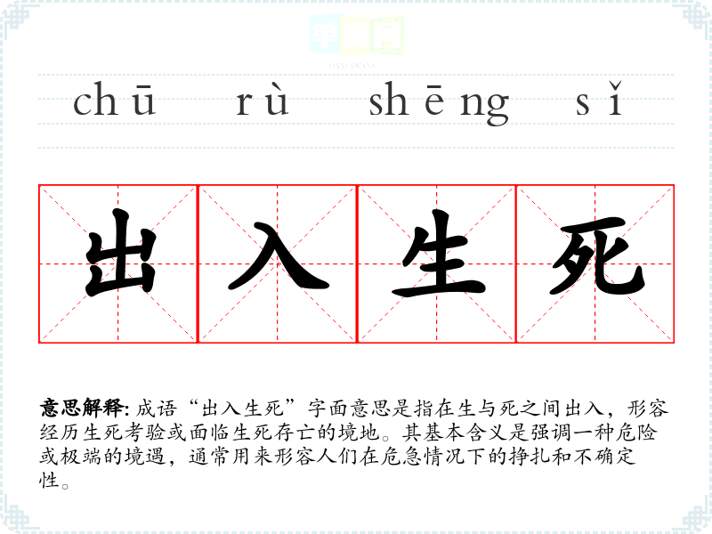 成语“出入生死”字面意思是指在生与死之间出入,形容经历生死考验或面临生死存亡的境地。其基本含义是强调一种危险或极端的境遇,通常用来形容人们在危急情况下的挣扎和不确定性。