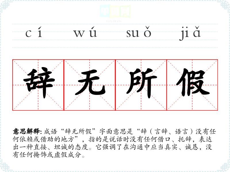 成语“辞无所假”字面意思是“辞(言辞、语言)没有任何依赖或借助的地方”,指的是说话时没有任何借口、托辞,表达出一种直接、坦诚的态度。它强调了在沟通中应当真实、诚恳,没有任何掩饰或虚假成分。