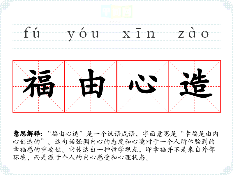 通过对“福由心造”的学,我更加认识到心态在生活中的重要性,在我的语言学和表达中,积极的心态不仅能够帮助我克服困难,还能让我更好地理解和表达幸福的真谛。这一成语的内涵将继续激励我在生活中保持积极向上的态度。