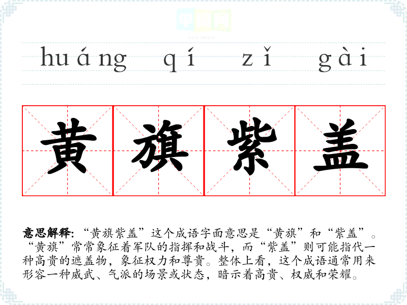 “黄旗紫盖”这个成语字面意思是“黄旗”和“紫盖”。“黄旗”常常象征着军队的指挥和战斗,而“紫盖”则可能指代一种高贵的遮盖物,象征权力和尊贵。整体上看,这个成语通常用来形容一种威武、气派的场景或状态,暗示着高贵、权威和荣耀。
