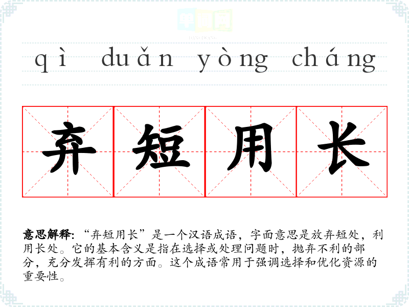“弃短用长”是一个汉语成语,字面意思是放弃短处,利用长处。它的基本含义是指在选择或处理问题时,抛弃不利的部分,充分发挥有利的方面。这个成语常用于强调选择和优化资源的重要性。