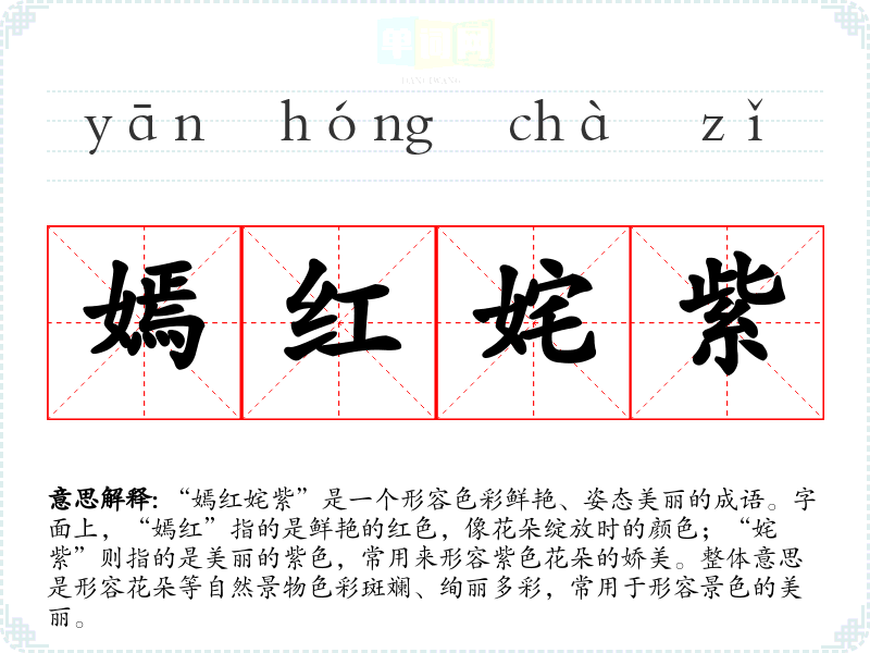 | 嫣红姹紫 | 指花色娇艳,亦指娇艳的花。 |