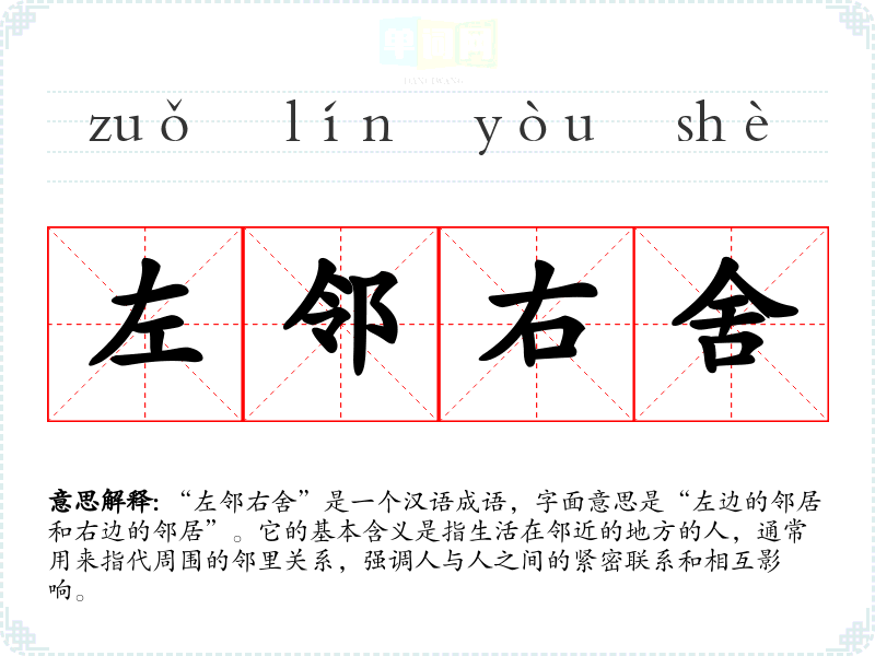 “左邻右舍”是一个汉语成语,字面意思是“左边的邻居和右边的邻居”。它的基本含义是指生活在邻近的地方的人,通常用来指代周围的邻里关系,强调人与人之间的紧密联系和相互影响。