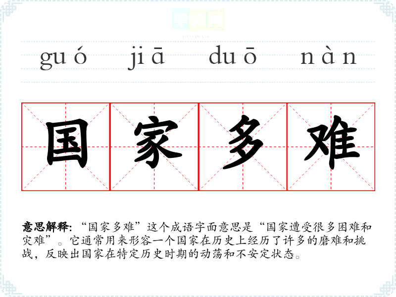 “国家多难”这个成语字面意思是“国家遭受很多困难和灾难”。它通常用来形容一个国家在历史上经历了许多的磨难和挑战,反映出国家在特定历史时期的动荡和不安定状态。