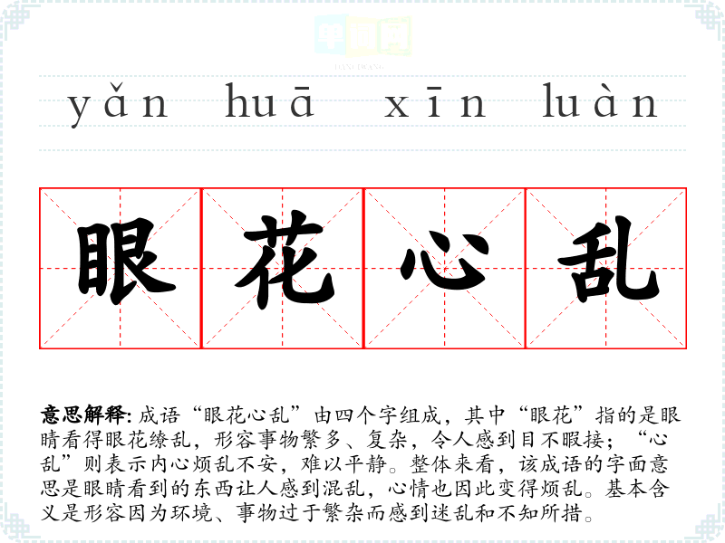 成语“眼花心乱”由四个字组成,其中“眼花”指的是眼睛看得眼花缭乱,形容事物繁多、复杂,令人感到目不暇接;“心乱”则表示内心烦乱不安,难以平静。整体来看,该成语的字面意思是眼睛看到的东西让人感到混乱,心情也因此变得烦乱。基本含义是形容因为环境、事物过于繁杂而感到迷乱和不知所措。
