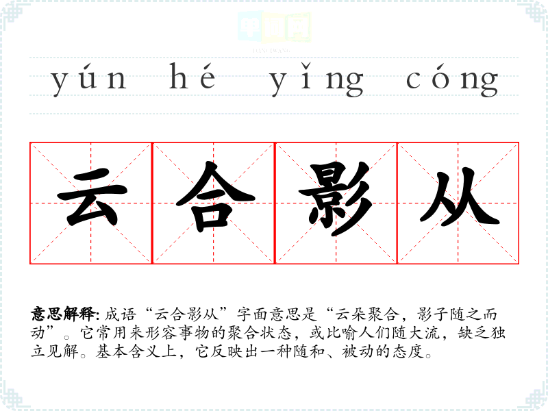 成语“云合影从”字面意思是“云朵聚合,影子随之而动”。它常用来形容事物的聚合状态,或比喻人们随大流,缺乏独立见解。基本含义上,它反映出一种随和、被动的态度。