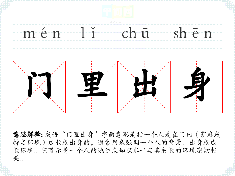 成语“门里出身”字面意思是指一个人是在门内(家庭或特定环境)成长或出身的,通常用来强调一个人的背景、出身或成长环境。它暗示着一个人的地位或知识水平与其成长的环境密切相关。