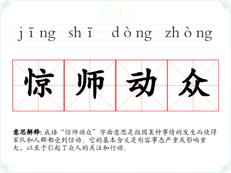 成语“惊师动众”字面意思是指因某种事情的发生而使得军队和人群都受到惊动。它的基本含义是形容事态严重或影响重大,以至于引起了众人的关注和行动。