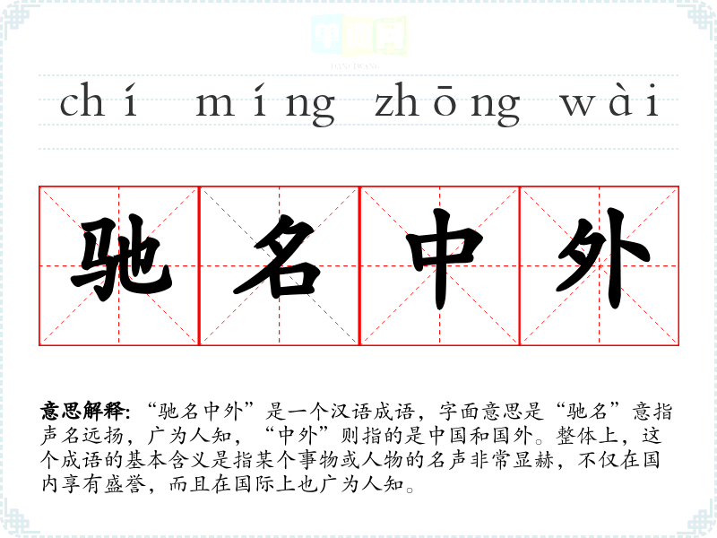 | 中外驰名 | 驰名:名声远扬。名声传遍了国内外。 |