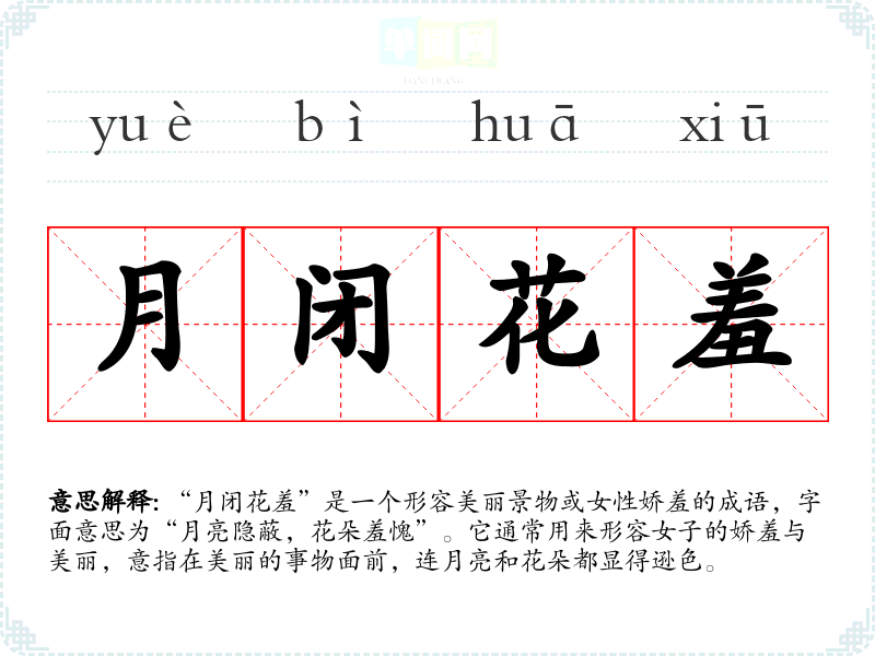 “月闭花羞”是一个形容美丽景物或女性娇羞的成语,字面意思为“月亮隐蔽,花朵羞愧”。它通常用来形容女子的娇羞与美丽,意指在美丽的事物面前,连月亮和花朵都显得逊色。