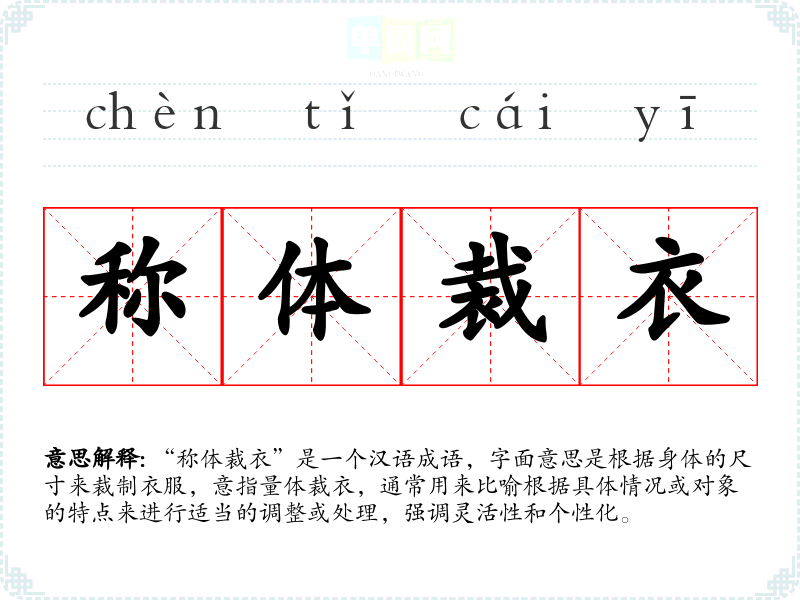 “称体裁衣”是一个汉语成语,字面意思是根据身体的尺寸来裁制衣服,意指量体裁衣,通常用来比喻根据具体情况或对象的特点来进行适当的调整或处理,强调灵活性和个性化。