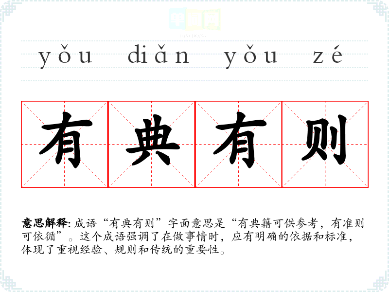 成语“有典有则”字面意思是“有典籍可供参考,有准则可依循”。这个成语强调了在做事情时,应有明确的依据和标准,体现了重视经验、规则和传统的重要性。
