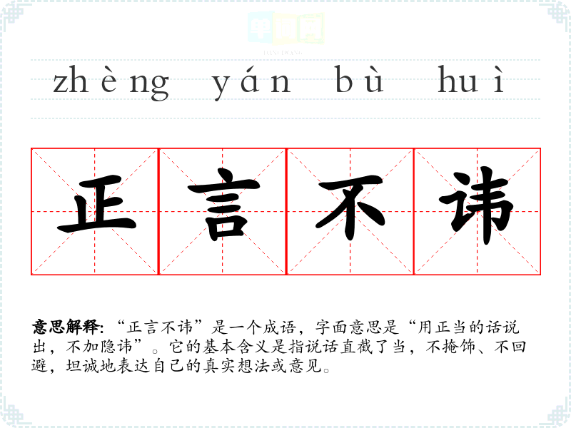 “正言不讳”是一个成语,字面意思是“用正当的话说出,不加隐讳”。它的基本含义是指说话直截了当,不掩饰、不回避,坦诚地表达自己的真实想法或意见。