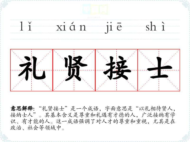 “礼贤接士”是一个成语,字面意思是“以礼相待贤人,接纳士人”。其基本含义是尊重和礼遇有才德的人,广泛接纳有学识、有才能的人。这一成语强调了对人才的尊重和重视,尤其是在政治、社会等领域中。