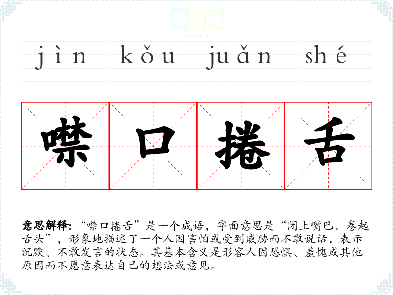 “噤口捲舌”是一个成语,字面意思是“闭上嘴巴,卷起舌头”,形象地描述了一个人因害怕或受到威胁而不敢说话,表示沉默、不敢发言的状态。其基本含义是形容人因恐惧、羞愧或其他原因而不愿意表达自己的想法或意见。