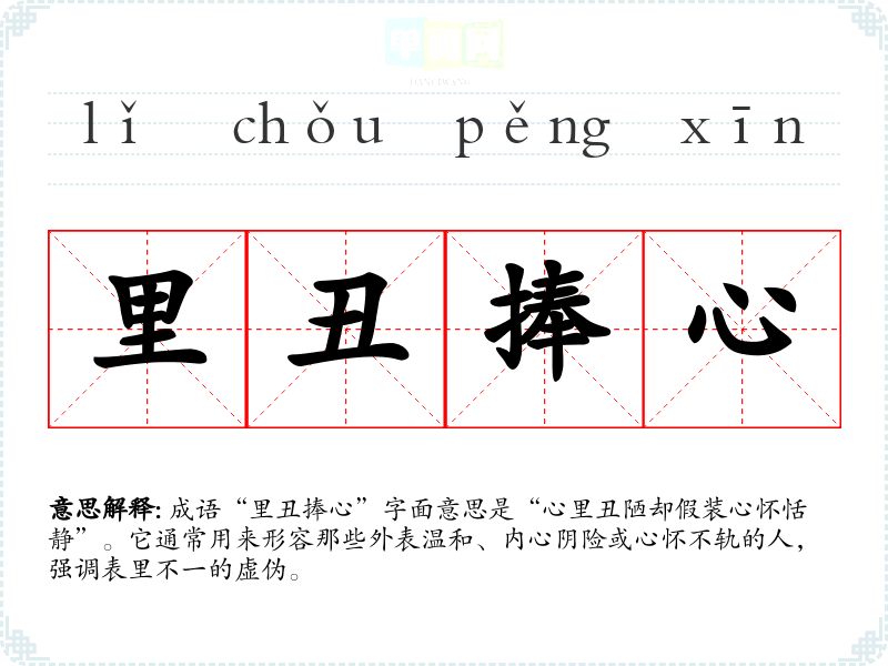成语“里丑捧心”字面意思是“心里丑陋却假装心怀恬静”。它通常用来形容那些外表温和、内心阴险或心怀不轨的人,强调表里不一的虚伪。