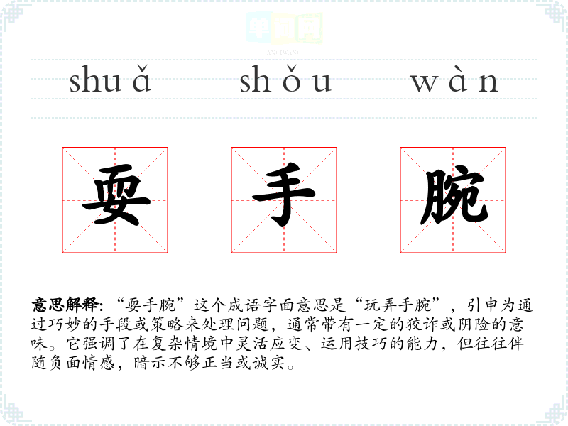 “耍手腕”这个成语字面意思是“玩弄手腕”,引申为通过巧妙的手段或策略来处理问题,通常带有一定的狡诈或阴险的意味。它强调了在复杂情境中灵活应变、运用技巧的能力,但往往伴随负面情感,暗示不够正当或诚实。