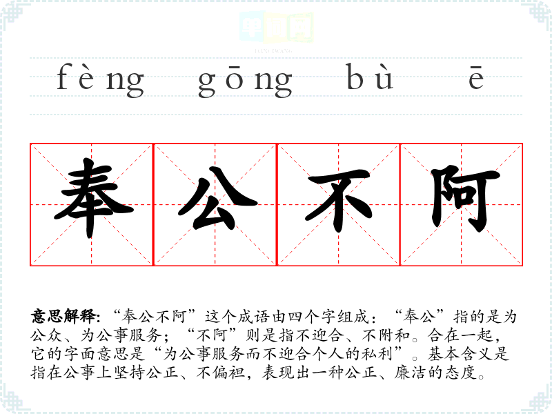 “奉公不阿”这个成语由四个字组成:“奉公”指的是为公众、为公事服务;“不阿”则是指不迎合、不附和。合在一起,它的字面意思是“为公事服务而不迎合个人的私利”。基本含义是指在公事上坚持公正、不偏袒,表现出一种公正、廉洁的态度。