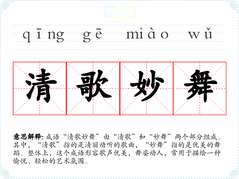 成语“清歌妙舞”由“清歌”和“妙舞”两个部分组成。其中,“清歌”指的是清丽动听的歌曲,“妙舞”指的是优美的舞蹈。整体上,这个成语形容歌声优美,舞姿动人,常用于描绘一种愉悦、轻松的艺术氛围。