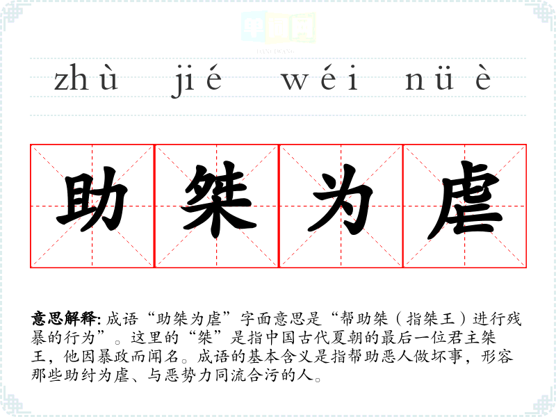 成语“助桀为虐”字面意思是“帮助桀(指桀王)进行残暴的行为”。这里的“桀”是指**古代夏朝的最后一位君主桀王,他因暴政而闻名。成语的基本含义是指帮助恶人做坏事,形容那些助纣为虐、与恶势力同流合污的人。