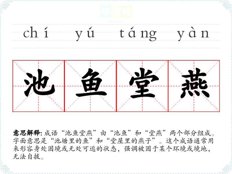 成语“池鱼堂燕”由“池鱼”和“堂燕”两个部分组成。字面意思是“池塘里的鱼”和“堂屋里的燕子”。这个成语通常用来形容身处困境或无处可逃的状态,强调被困于某个环境或境地,无法自拔。
