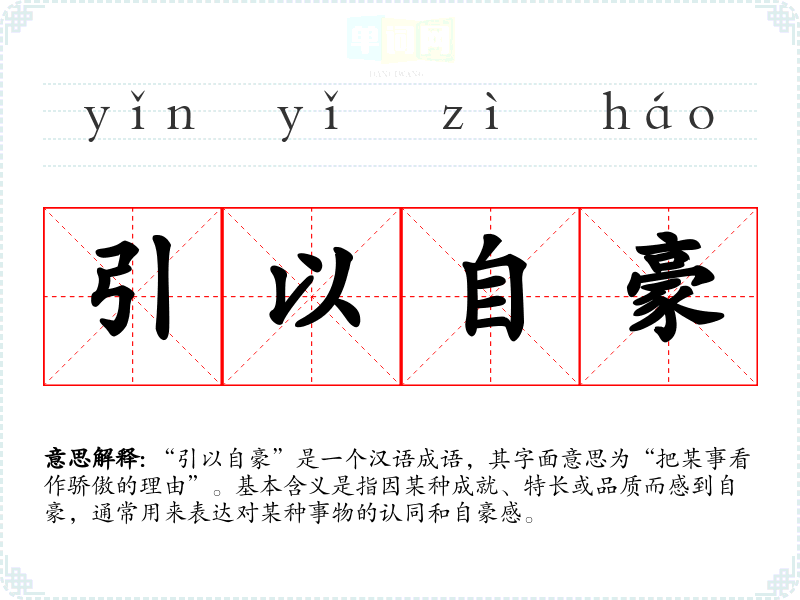 “引以自豪”并没有明确的历史典故或文献出处,但可以理解为一种普遍的情感表达,在传统文化中,强调个人或集体的成就与自豪感是常见的主题。这种成语在现代汉语中广泛使用,体现了对成功或优秀品质的重视。
