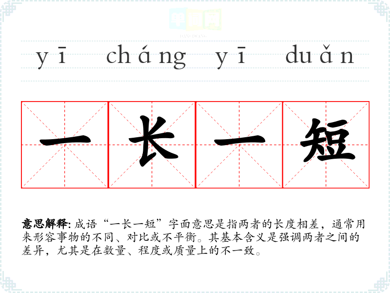 成语“一长一短”字面意思是指两者的长度相差,通常用来形容事物的不同、对比或不平衡。其基本含义是强调两者之间的差异,尤其是在数量、程度或质量上的不一致。