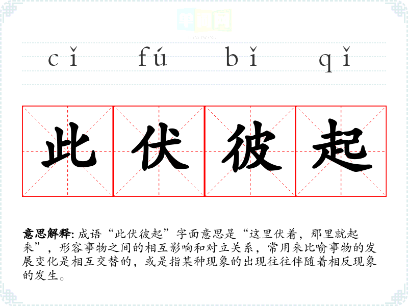 成语“此伏彼起”字面意思是“这里伏着,那里就起来”,形容事物之间的相互影响和对立关系,常用来比喻事物的发展变化是相互交替的,或是指某种现象的出现往往伴随着相反现象的发生。