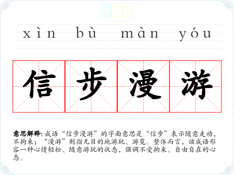 成语“信步漫游”的字面意思是“信步”表示随意走动,不拘束;“漫游”则指无目的地游玩、游览。整体而言,该成语形容一种心情轻松、随意游玩的状态,强调不受拘束、自由自在的心态。