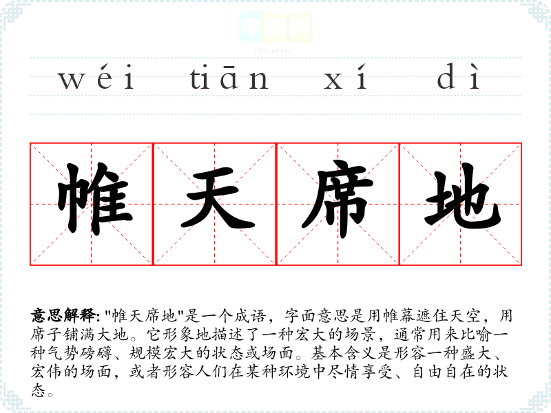 "帷天席地"是一个成语,字面意思是用帷幕遮住天空,用席子铺满大地。它形象地描述了一种宏大的场景,通常用来比喻一种气势磅礴、规模宏大的状态或场面。基本含义是形容一种盛大、宏伟的场面,或者形容人们在某种环境中尽情享受、自由自在的状态。