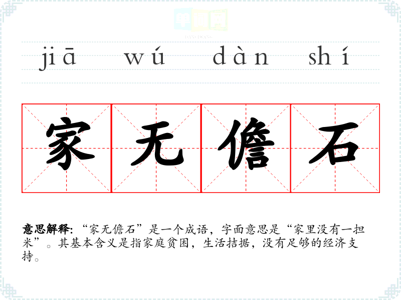 “家无儋石”是一个成语,字面意思是“家里没有一担米”。其基本含义是指家庭贫困,生活拮据,没有足够的经济支持。