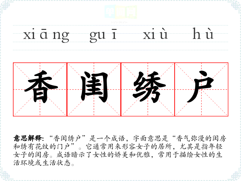 通过对“香闺绣户”的深入分析,可以看到这个成语在语言学*和表达中的重要性。它不仅仅是一个成语,更是历史文化和社会背景的体现。掌握这样的成语,能够丰富我们的表达,增强语言的表现力,也能让我们更好地理解和欣赏**传统文化的深厚底蕴。