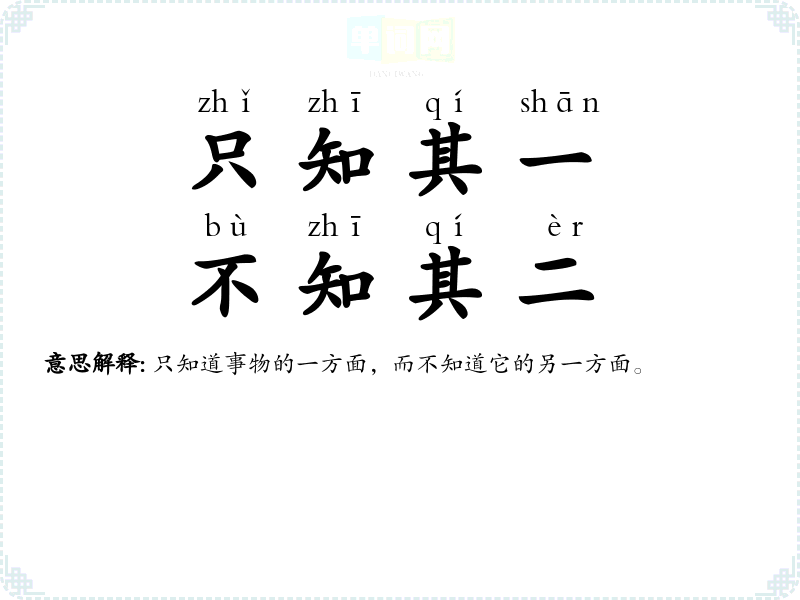 | 一知半解 | 知道得不全面,理解得也不透彻。 |