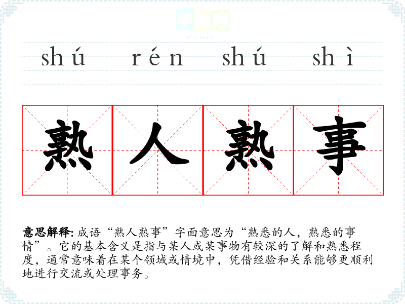 成语“熟人熟事”字面意思为“熟悉的人,熟悉的事情”。它的基本含义是指与某人或某事物有较深的了解和熟悉程度,通常意味着在某个领域或情境中,凭借经验和关系能够更顺利地进行交流或处理事务。
