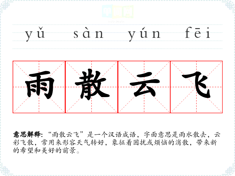 “雨散云飞”是一个汉语成语,字面意思是雨水散去,云彩飞散,常用来形容天气转好,象征着困扰或烦恼的消散,带来新的希望和美好的前景。