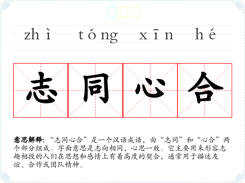 “志同心合”是一个汉语成语,由“志同”和“心合”两个部分组成。字面意思是志向相同,心思一致。它主要用来形容志趣相投的人们在思想和感情上有着高度的契合,通常用于描述友谊、合作或团队精神。